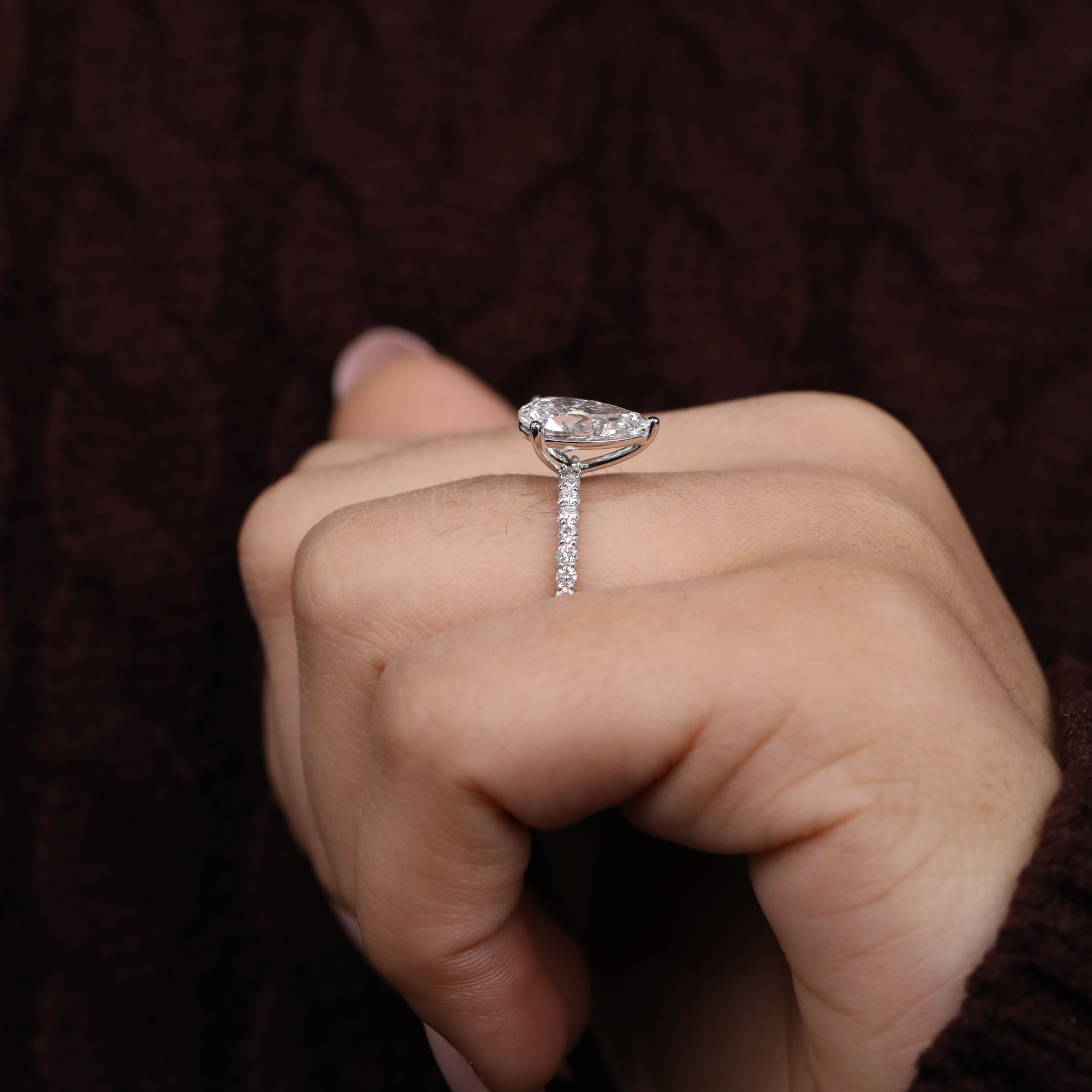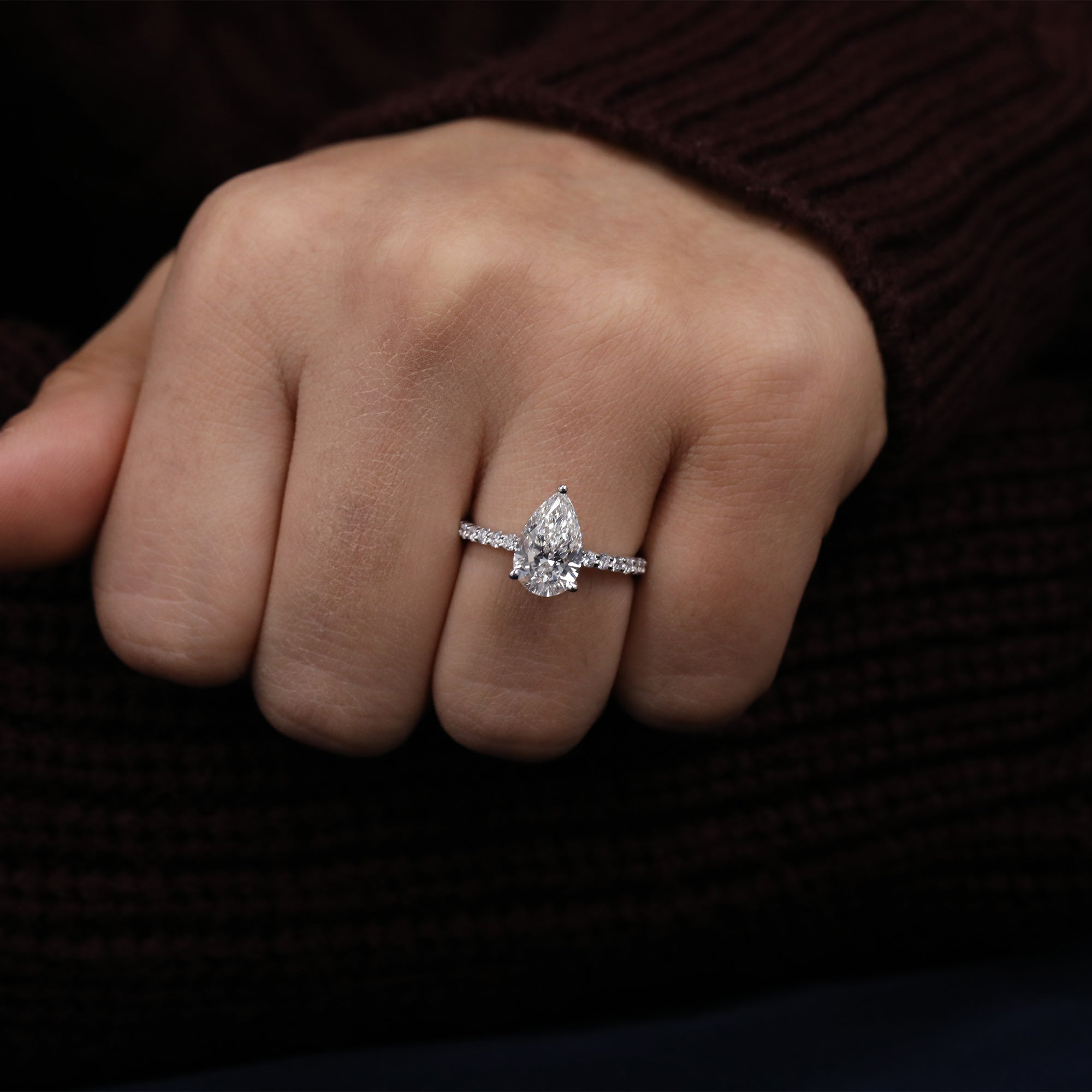 Radiant and refined, this pear cut lab grown diamond ring captures timeless elegance with modern sophistication. The teardrop shaped center diamond sparkles brilliantly atop a pavé set band, creating a dazzling display of light and grace. Ethically crafted with sustainable lab grown diamonds, this ring is a stunning choice for engagements or special milestones. A true symbol of love, purity, and conscious luxury - designed to shine for a lifetime.